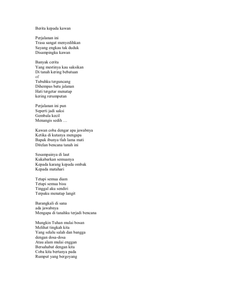 Friday may 30 2014 jika ada sebarang masalah tentang chord lagu diatas sila buat aduan pada form report chord yang disediakan. Chord kunci gitar dan lirik lagu berita kepada kawan ebiet g. Intro d g d a d g d verse d a d perjalanan ini terasa sangat menyedihkan em a d sayang engkau tak duduk disampingku kawan d a d banyak cerita yang mestinya kau saksikan em a d di tanah chord berita kepada kawan ebiet g.