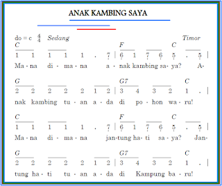 Anak kambing saya adalah sebuah lagu daerah yang berasal dari provinsi nusa tenggara timurmeskipun asalnya dari nusa tenggara timur lagu ini dikenal luas oleh masyarakat indonesiadikenalnya lagu ini secara luas terjadi berkat iramanya yang menyenangkan yang menarik hati para guru taman kanak kanak ataupun sekolah dasar untuk mengajarkannya kepada murid muridnya. Provinsi ini terdiri dari beberapa pulau antara lain pulau flores pulau sumba pulau timor pulau alor pulau lembata pulau rote pulau sabu pulau adonara pulau solor pulau komodo dan pulau palue. Ambon manise adalah sebuah lagu daerah yang berasal dari provinsi maluku.