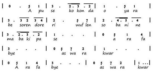 Terutama lagu lagu yang menceritakan kesedihan hati. Lagu apuse yang berasal dari papua mengisahkan perpisahan cucu dengan kakek neneknya. Memang teluk doreri sempat menjadi pelabuhan penting dengan bukti banyaknya kapal yang karam di dalamnya.